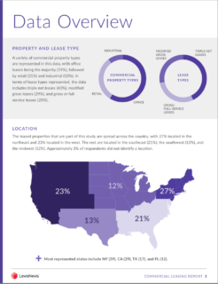 Already, LexisNexis has collected data on more than 300 private commercial leases, most for office, retail or industrial leases. From those leases, it is tracking data on more than 40 deal points. These include notice and cure rights, guaranty structure, tenant options, rent abatement, tenant improvements, holdover, and force majeure.