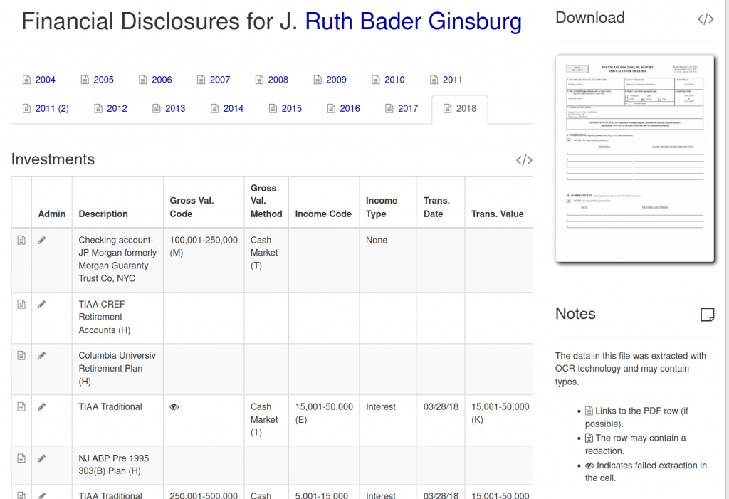 The result is a database of roughly 1.5 million investment transactions, 14,000 reimbursements, 12,000 sources of non-investment income, and 1,700 gifts. It also contains data on agreements and debts of the judges and their spouses.