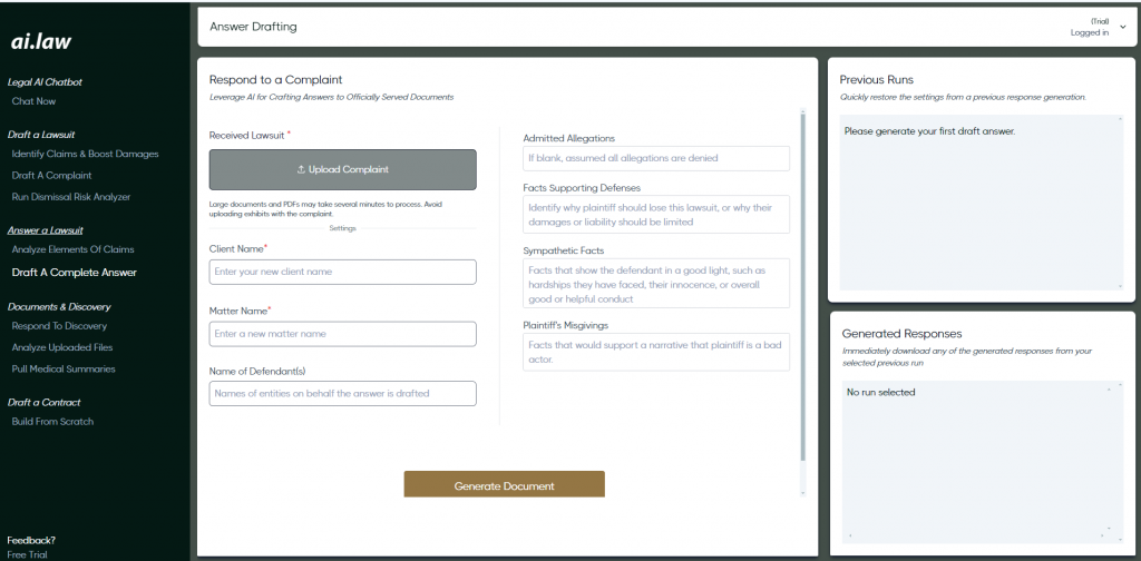 While Ai.law already had modules for litigation tasks such as answering a lawsuit, responding to discovery, and pulling summaries from medical records, this new module allows a user to input relevant information about a case and generate a complete complaint.